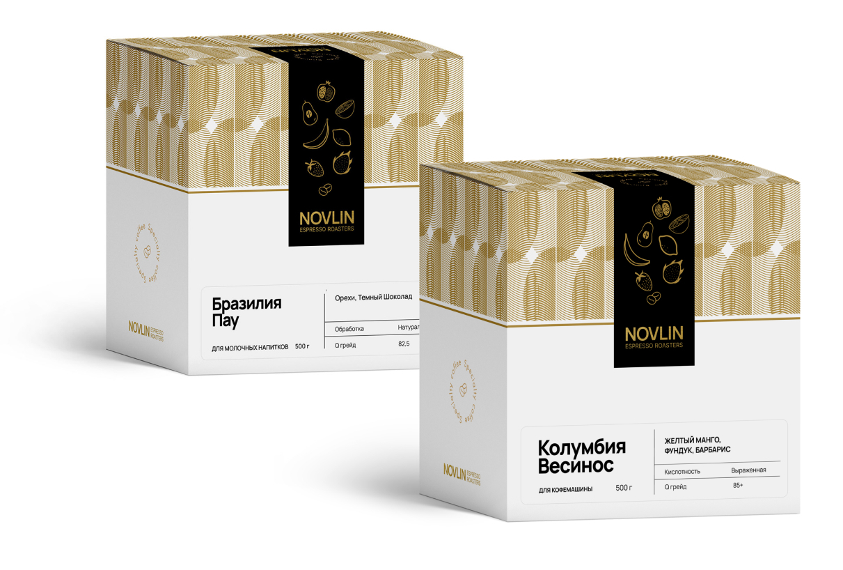Упаковка соответствует стилю сайта — минималистичная, использование белого и золотых цветов. Сделан один дизайн коробки, на которой меняется наклейка с названием для сокращения расходов на печать. В коробку вкладывается вакуумный пакет с клапаном дегазации.