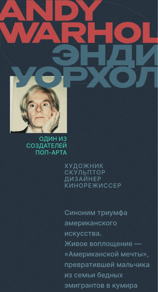 Сайт для конкурса Tilda Workshop, посвященный одному из самых известных и самых тиражируемых художников 20 века Энди Уорхолу.